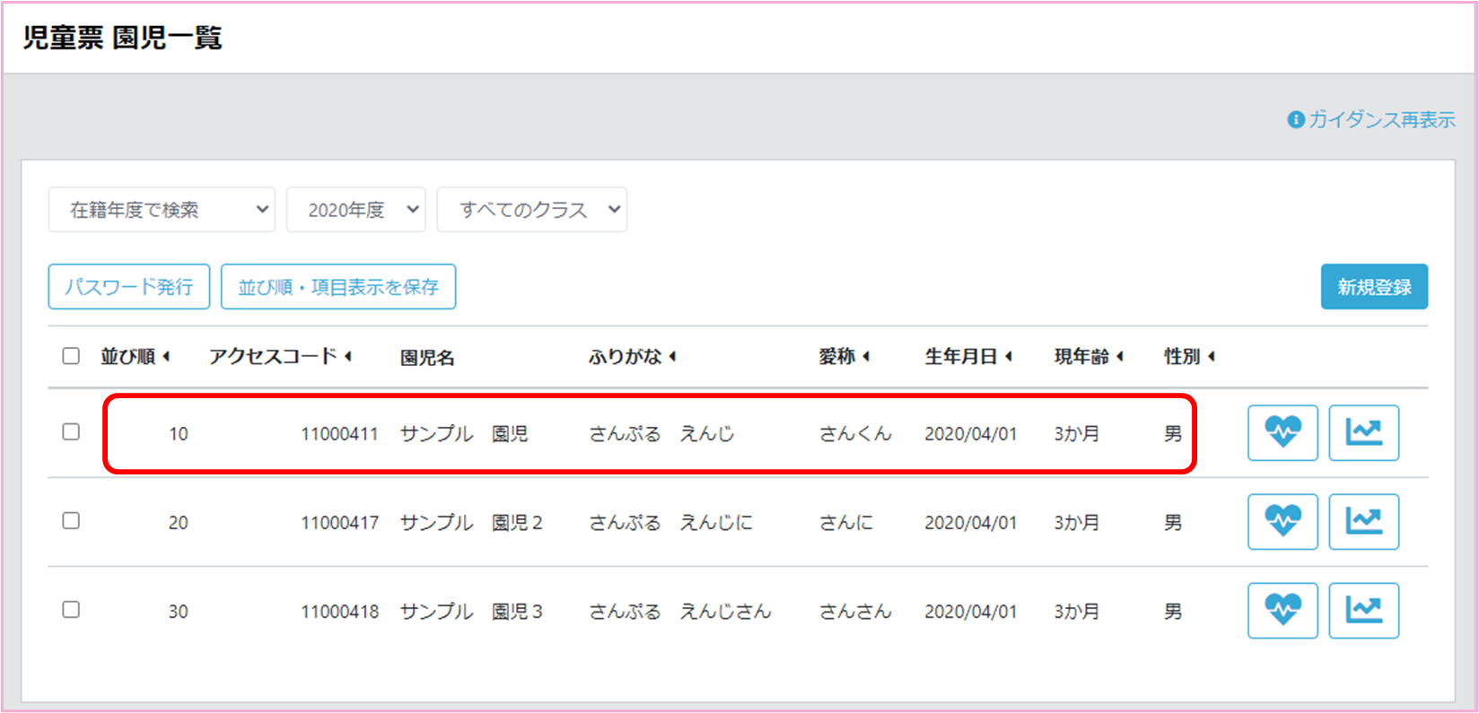 記録を確認したい園児の行を押下します。