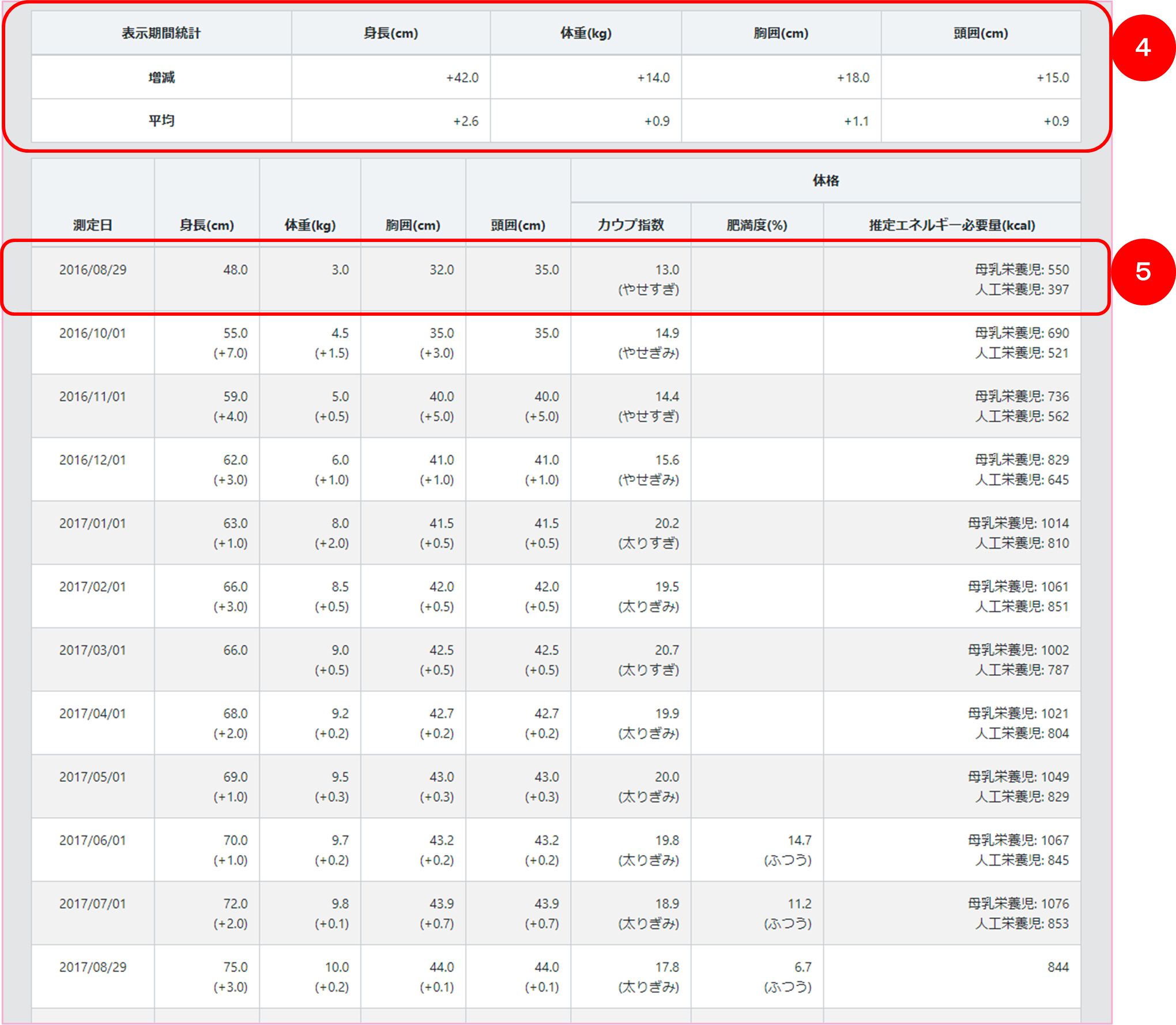 ④ 記録の増減、平均の集計値が表示されます