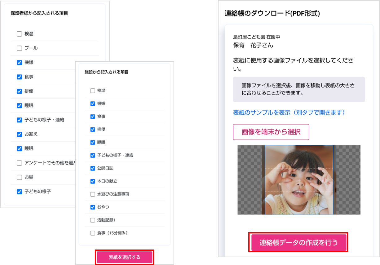5. 表示画像を端末から選択し(画像調整)[連絡帳データの作成を行う]をタップします。