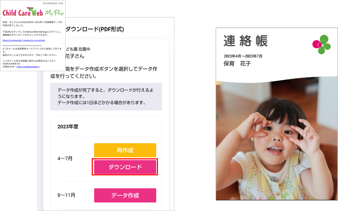 6. 連絡帳データの作成が完了しますと登録したメールアドレスへ完了メールが届きますので、MyPageへログインをし、作成されたデータをダウンロードしてください。