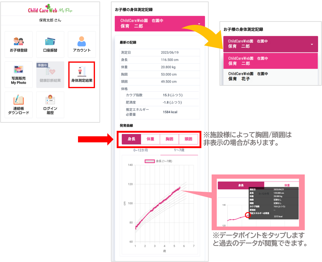 2. 身長/体重/胸囲/頭囲タブで切り替え